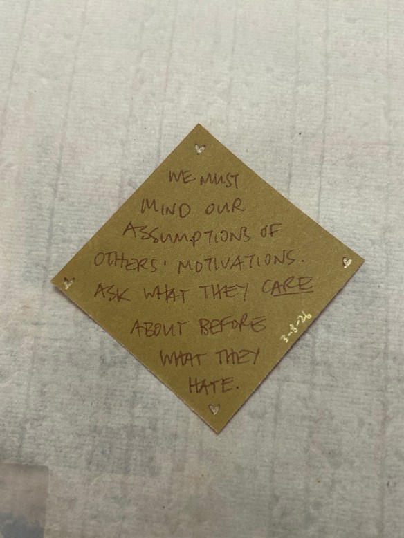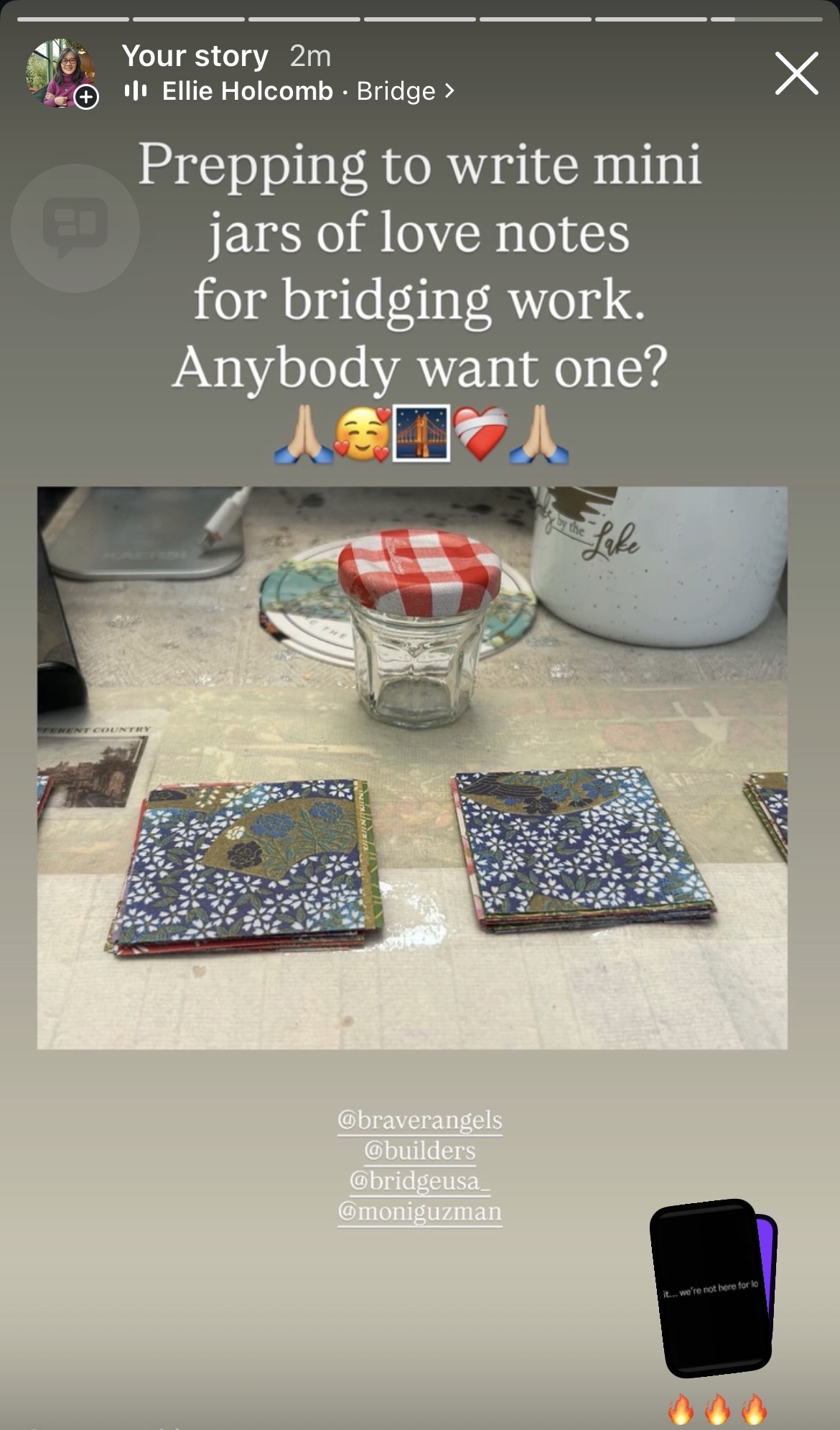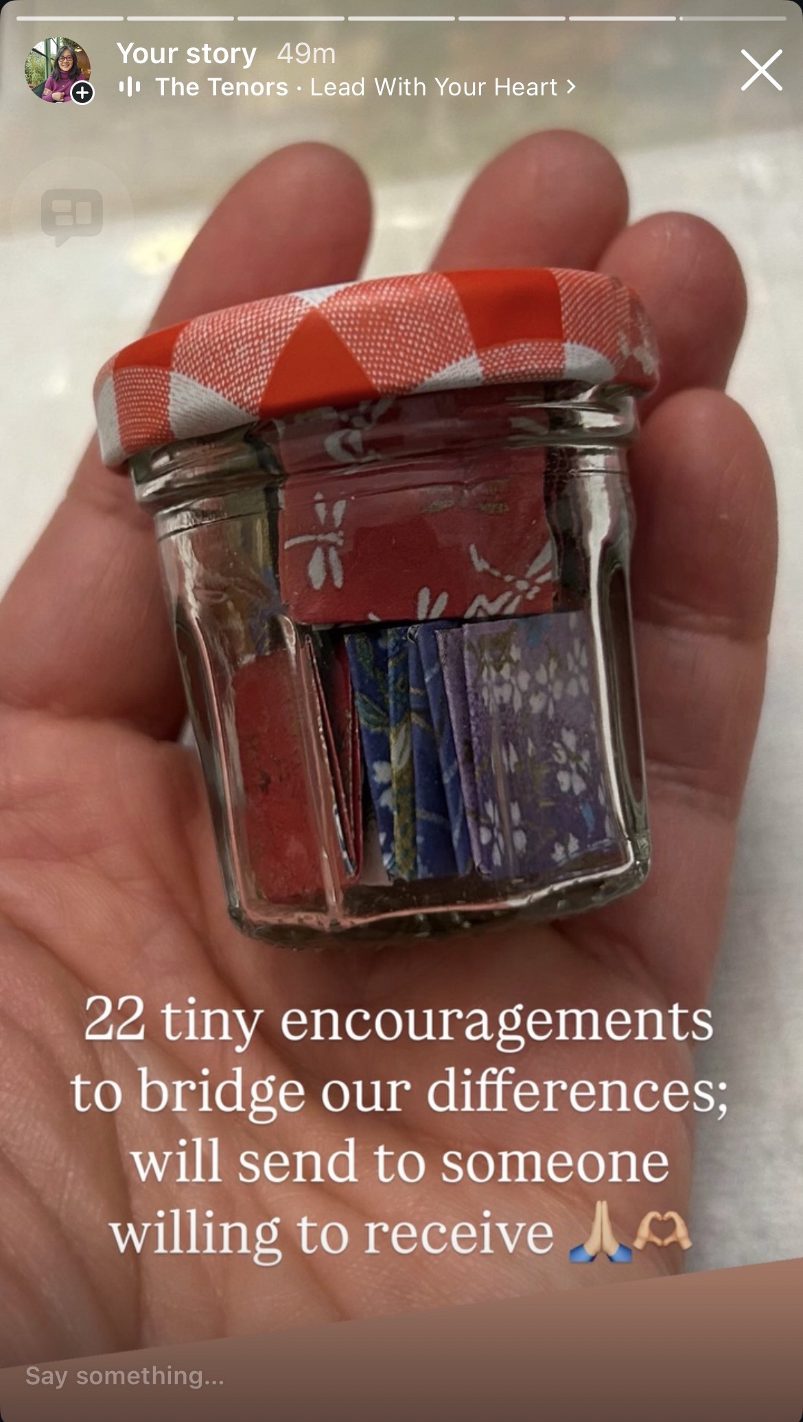 “Prepping to write mini jars of love notes for bridging work. Anybody want one?”“We must mind our assumptions of others’ motivations. Ask what they *care* about before that they hate.”“22 tiny encouragemennts to bridge our differences; will send to someone wililng to receive.”