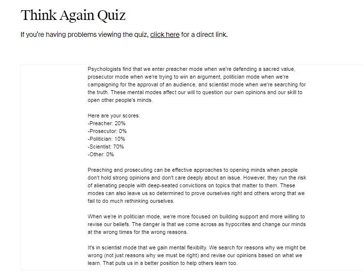 Adam Grant’s new book, Think Again, will be my personal and professional bible for a while, I think. Its central tenets are intellectual humility and cognitive flexibility. I may speak and write like a preacher about things that matter deeply to me. But I will strive to think more like a scientist, seeking truth and connection above winning arguments and/or proving other people wrong.