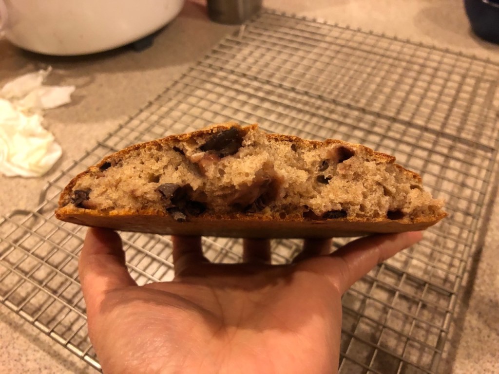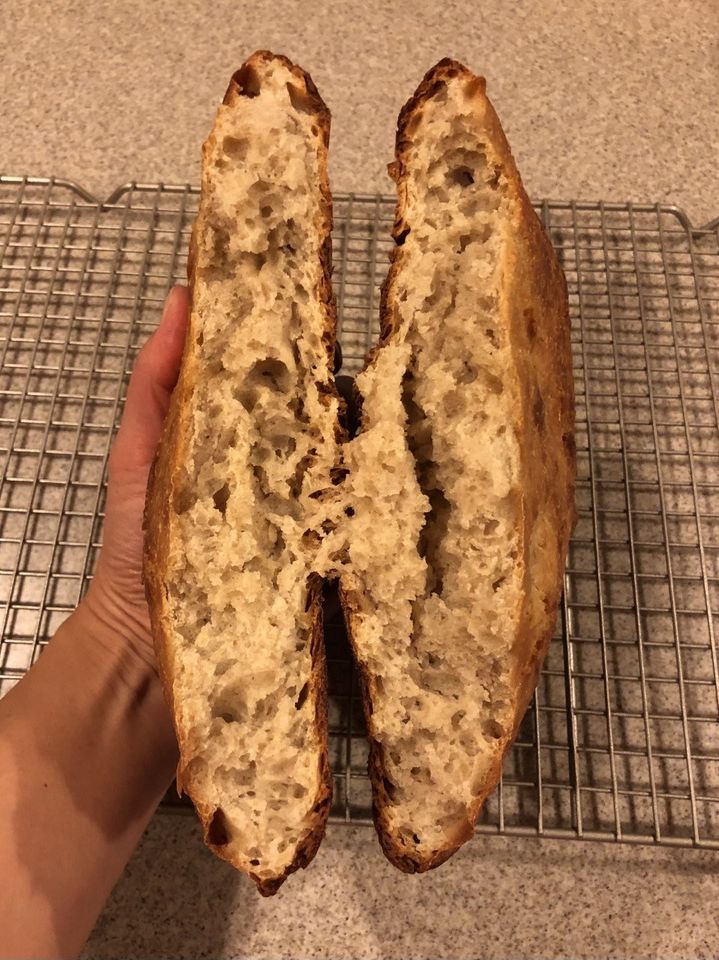 Still, I resisted following any recipe. I did not want to commit whole loaf-sized quantities of ingredients, only to make potentially inedible products. My eyeballing better approximated recommended ingredient ratios with the last experiment, and the dough expanded nicely through both proofing periods overnight and this afternoon, though much more laterally than vertically (will study more to figure that one out). I committed and purchased a Dutch oven, rationalizing that it could also be used for other purposes, and followed preheating and baking directions. And voila! I got a little loaf with a beautiful, crackling brown crust, a pleasing aroma, and an internal texture that could arguably be called bread. YAAAAAYY! We opened it while still warm, and the kids and I ate half of it inside five minutes.