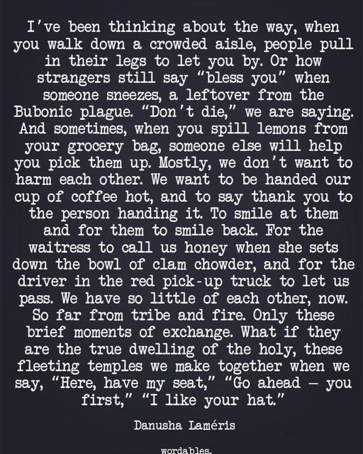 So unassuming yet poignant, down to earth and still profound. Perfect. I sent via email and also saved the image for myself, before sharing on my own FB page. The more I read it the more it resonated. “Mostly, we don’t want to harm each other… We want…For the waitress to call us honey… We have so little of each other, now…” So I shared with a few more friends–ones who I know practice making the “fleeting temples” (whom I admire and wish to emulate) and ones for whom I wish to meet and feel deeply the “true dwelling of the holy.”