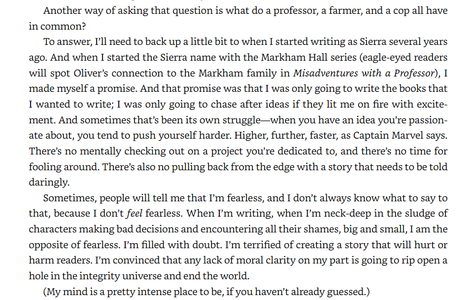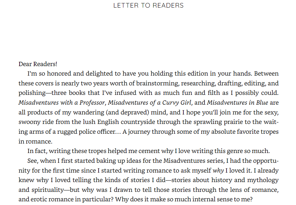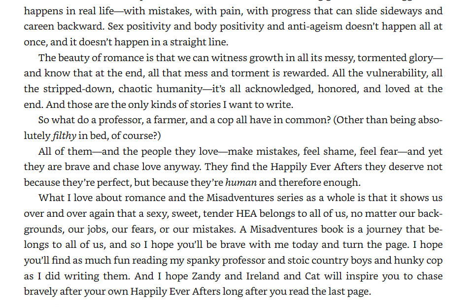 Sierra Simone has relieved me of that last burden. She has released her Misadventures collection in a new, single bound edition. It will be my fifth ever romance print purchase, all because of her Letter to Readers. In it, she explains the value of romance better than I ever could. I took screen snips of the Amazon text sample from the letter, to share here and document my endorsement. It just makes me beyond joyous that writers feel more and more brave, safe, and validated to express these deep, universally human stirrings. Their expressions resonate with, summon, and connect to that profound inner sense and knowing that our culture would sooner have us conceal and repress.