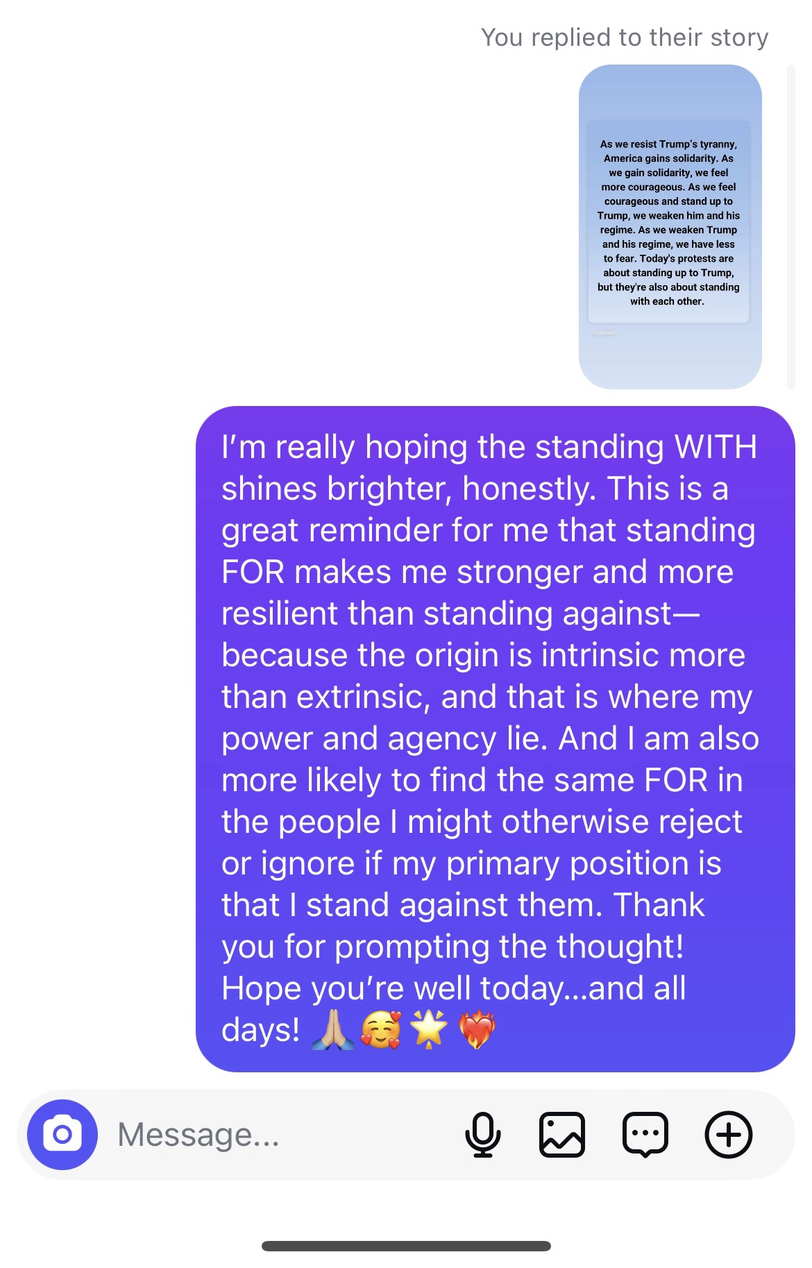 “There are so many calls to ‘fight,’ so many adversarial, us vs. them, good vs. evil narratives surrounding us right now. And while I abhor so many actions taken by ‘leaders,’ I still resist to call them evil and dehumanize them… That feels antithetical to the ethos of love and connection that I wish/strive to live by… But OMG it is challenging to resist that ad hominem train! *sigh*