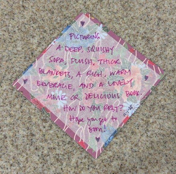 8. Picturing a deep, squishy sofa, plush, thick blankets, a rich, warm beverage, and a lovely movie or delicious book. How do you rest? Hope you get to soon!