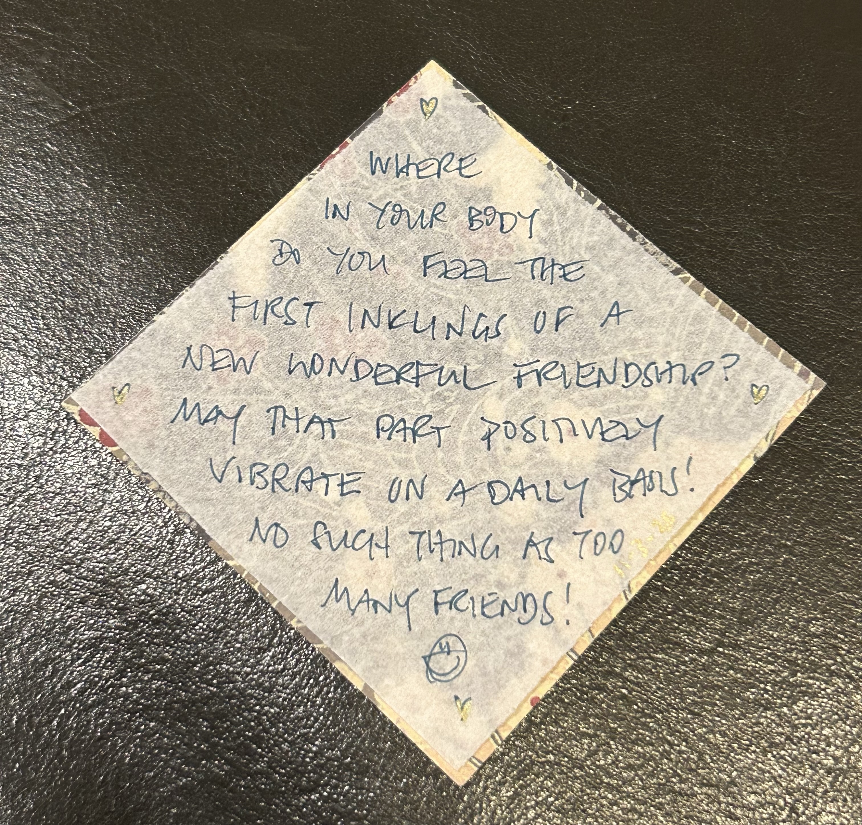 5. Where in your body do you feel the first inklings of a new wonderful friendship? May that part positively vibrate on a daily basis! No such thing as too many friends! π