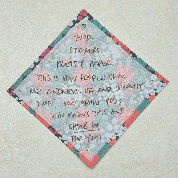 11. Food. Stickers. Pretty paper. Whis is how people show me kindness. Oh and quality time. How about you? Who knows this and shows up for you?