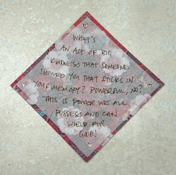 7. What’s an act of big kindness that someone showed you that sticks in your memory? Powerful, no? This is power we all possess and can wield for good!