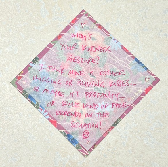 3. What’s your kindness gesture? I think mine is either hugging or blowing kisses… Or maybe profanity… Or some kind of face… Depends on the situation!