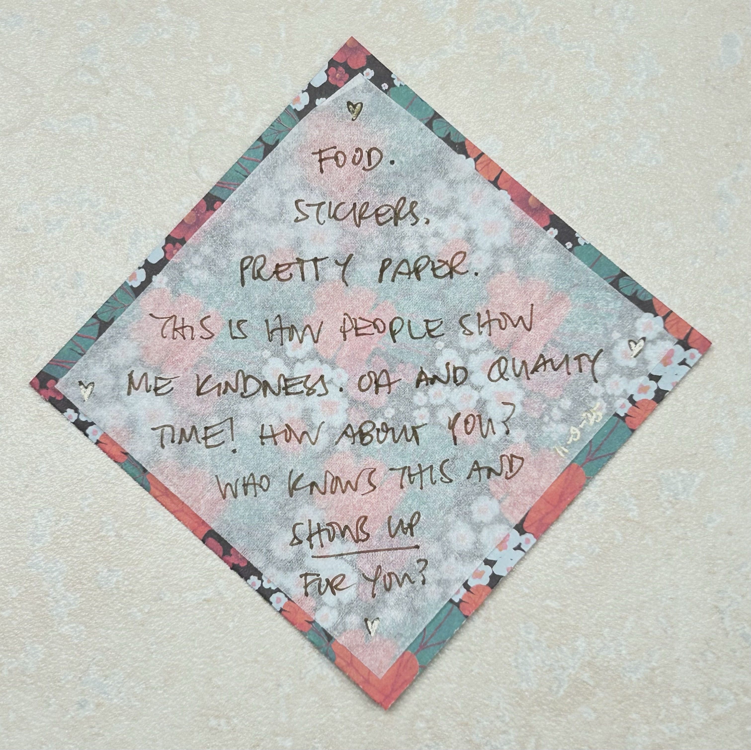 11. Food. Stickers. Pretty paper. Whis is how people show me kindness. Oh and quality time. How about you? Who knows this and shows up for you?
