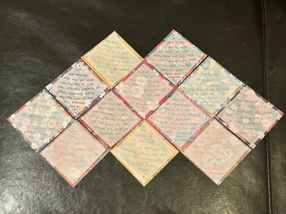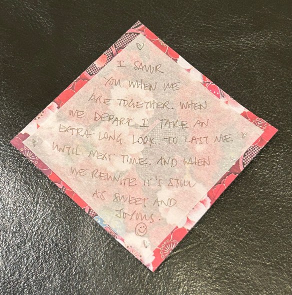 Day 13 of Love Notes! Unlucky, perhaps? [Correction: this is Day 14] The Wi-Fi is out and the internet signal at my house is poor. So we do what we can. The daily dozen are written below. I will upload and update with photos when I can.