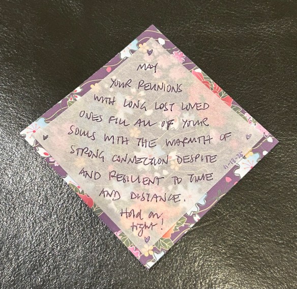Wishing us all the deep, fulfilling feeling of special connection from reuniting with those who see us, know us, and love us, all through the years. May these relationships be ever accessible, to pull us up from any depth, shine onto us in any darkness.