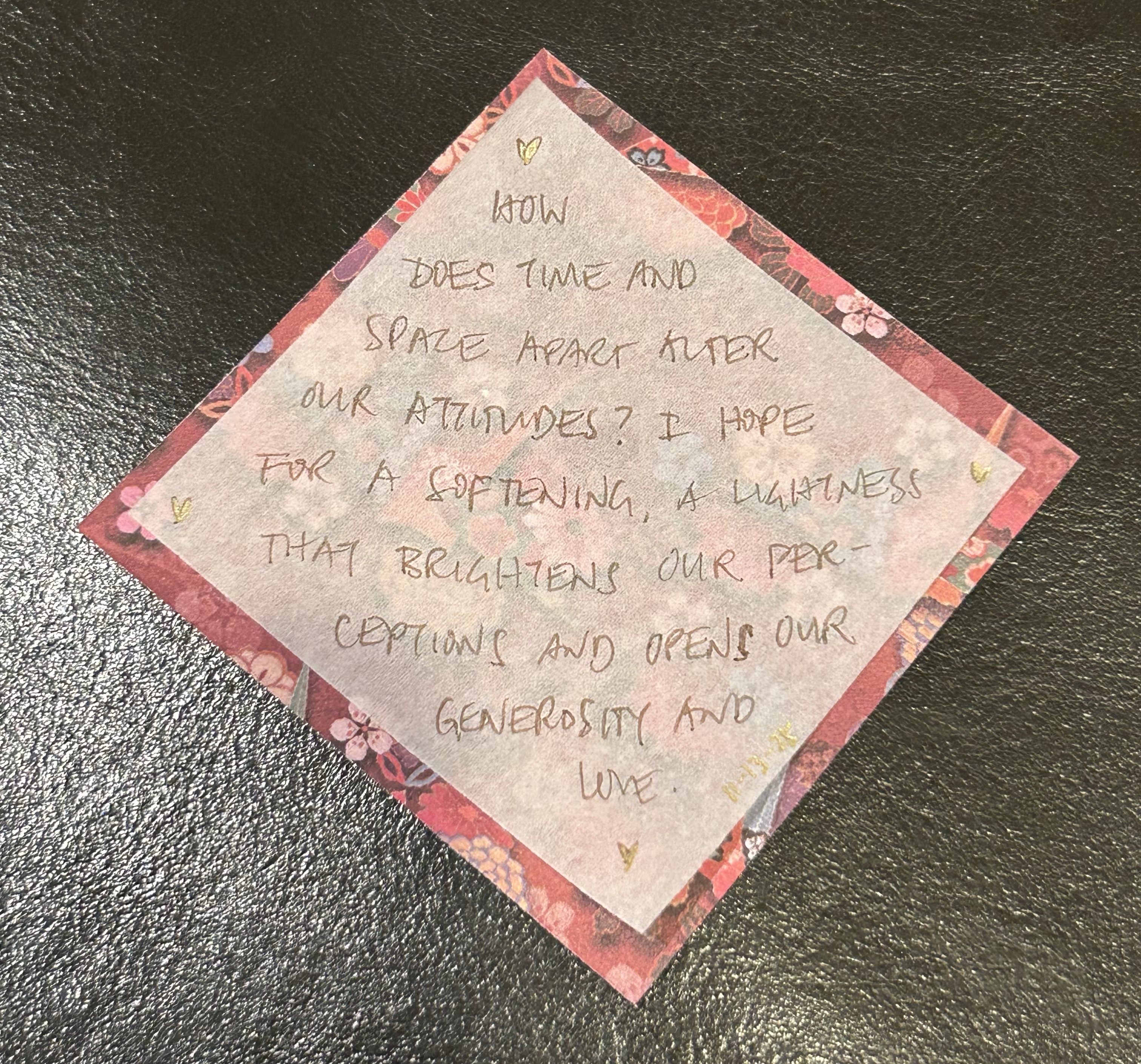 10. How does time and space apart alter our attitudes? I hope for a softening, a lightness that brightens our perceptions and opens our generosity and love.