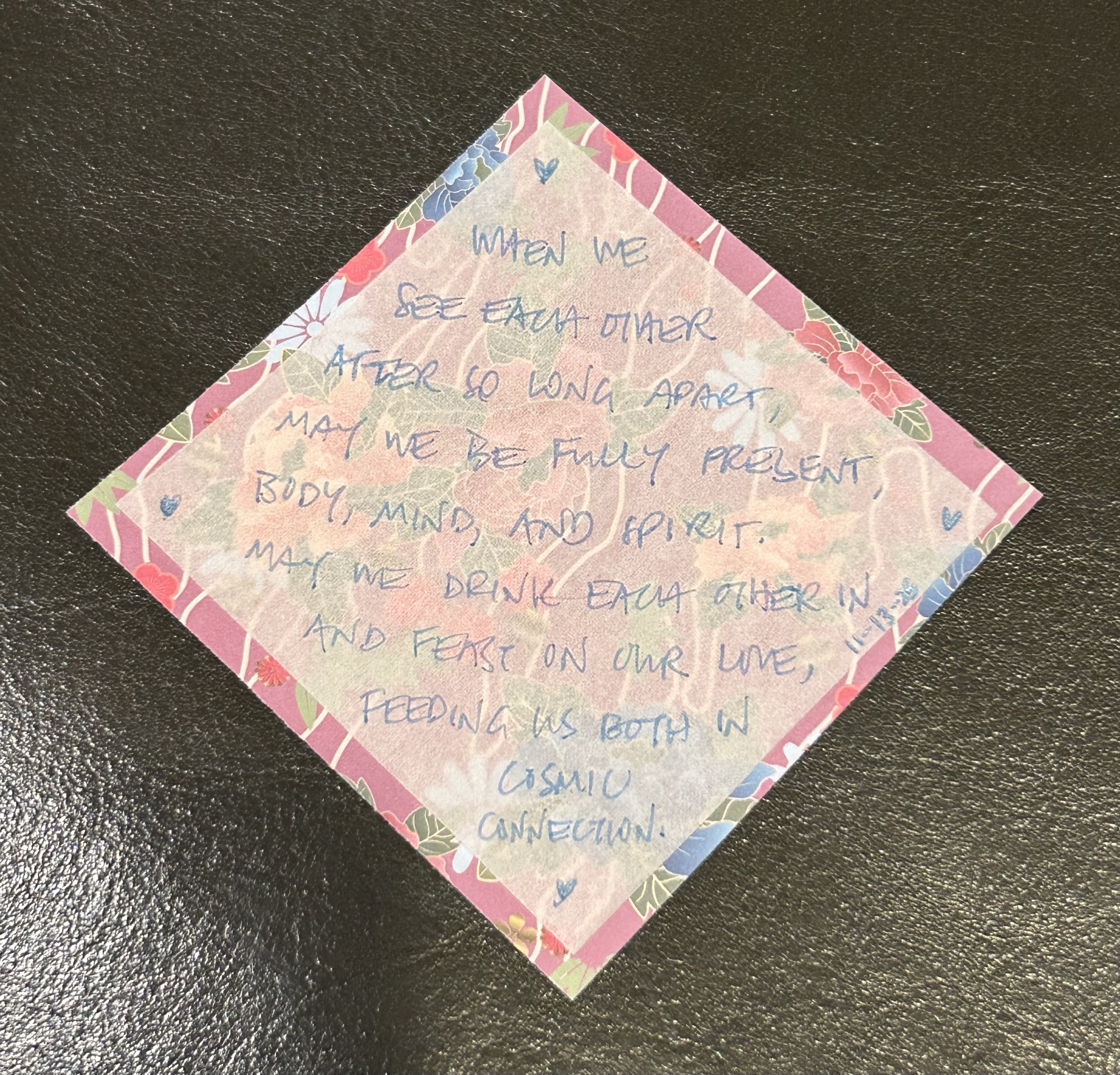 6. When we see each other after so long apart, may we be fully present, body, mind, and spirit. May we drink each other in and feast on our love, feeding us both in cosmic connection.
