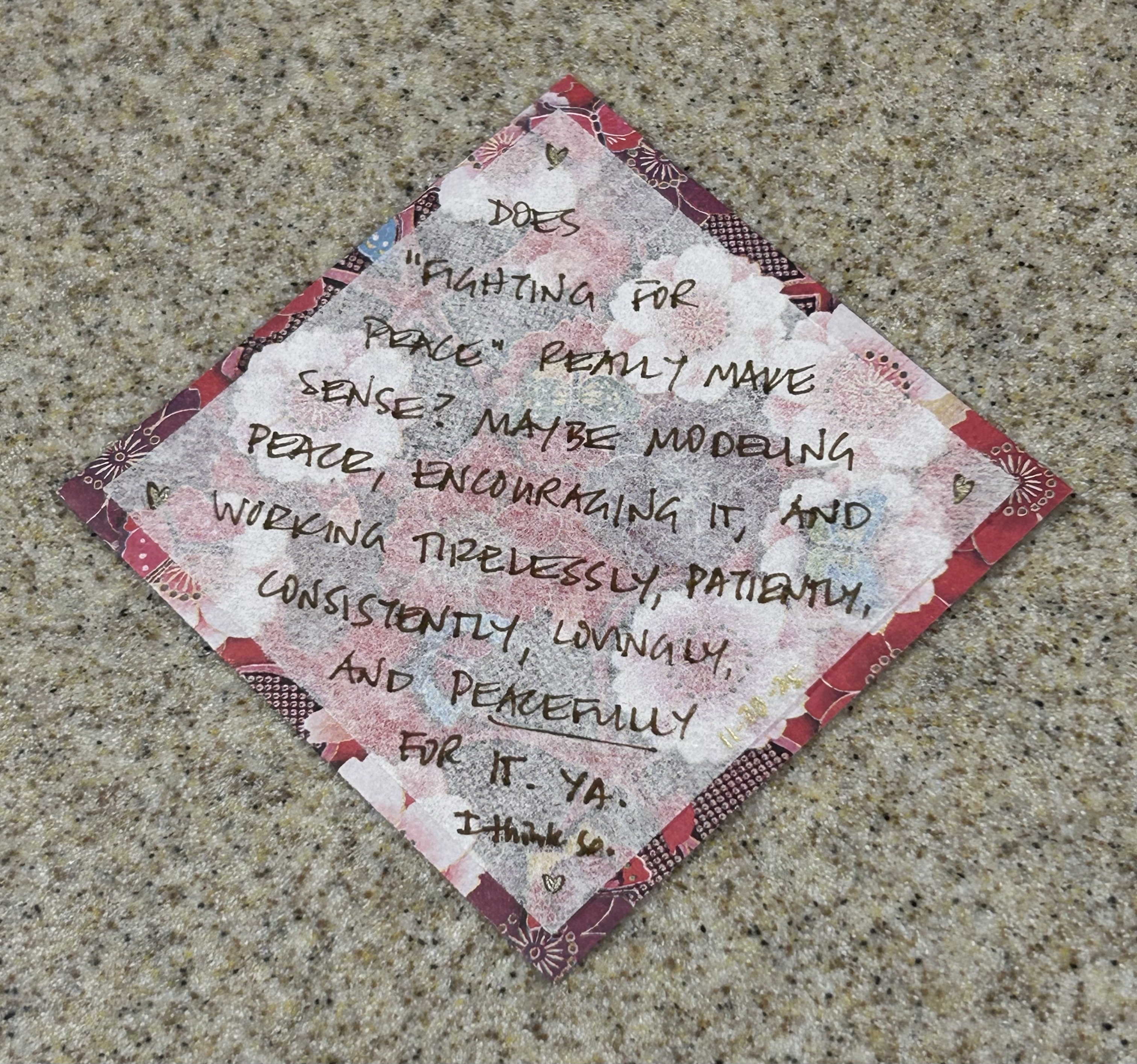 8. Does “fighting for peace” really make sense? Maybe modeling peace, encouraging it, and working tirelessly, patiently, consistently, lovingly, and peacefully for it. Ya. I think so.