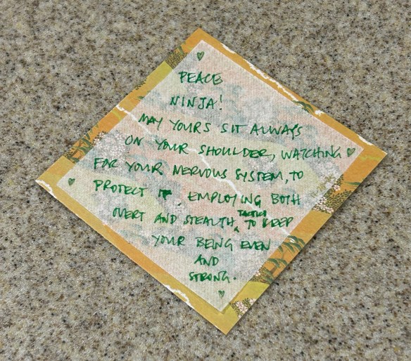 2. Peace ninja! May yours sit always on your shoulder, watching for your nervous system, to protect it, employing both overt and stealth tactics to keep your being even and strong.