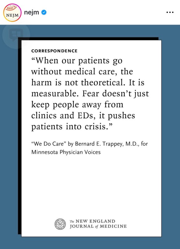 Federal immigration and border patrol abductions cause active, direct, and mortal harm to people. The lack of due process prevents any kind of record or recourse for their medical care, the morbidity and mortality of which boggles the mind. That our federal government is the original perpetrator of such traumatic pain and suffering to so many, regardless of immigration status, is beyond egregious. Racial profiling resulting in violently forceful detainment, separating parents from their terrified and then unattended children, rightly causes people of color (because this isn’t happening to white people), regardless of immigration or citizen status, to avoid leaving their homes, forgoing necessary medical care (eg labor and delivery, wound care, cancer care). It’s sickening and makes me rage. Hear from a veteran physician in Minnesota as she lists case after case: