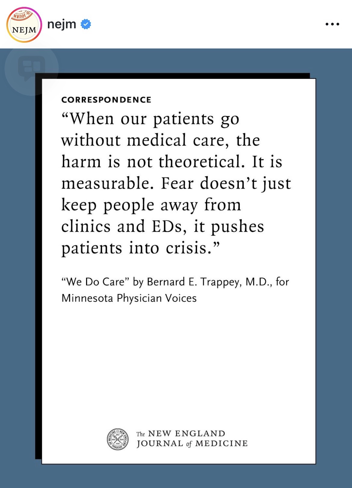 Federal immigration and border patrol abductions cause active, direct, and mortal harm to people. The lack of due process prevents any kind of record or recourse for their medical care, the morbidity and mortality of which boggles the mind. That our federal government is the original perpetrator of such traumatic pain and suffering to so many, regardless of immigration status, is beyond egregious. Racial profiling resulting in violently forceful detainment, separating parents from their terrified and then unattended children, rightly causes people of color (because this isn’t happening to white people), regardless of immigration or citizen status, to avoid leaving their homes, forgoing necessary medical care (eg labor and delivery, wound care, cancer care). It’s sickening and makes me rage. Hear from a veteran physician in Minnesota as she lists case after case: