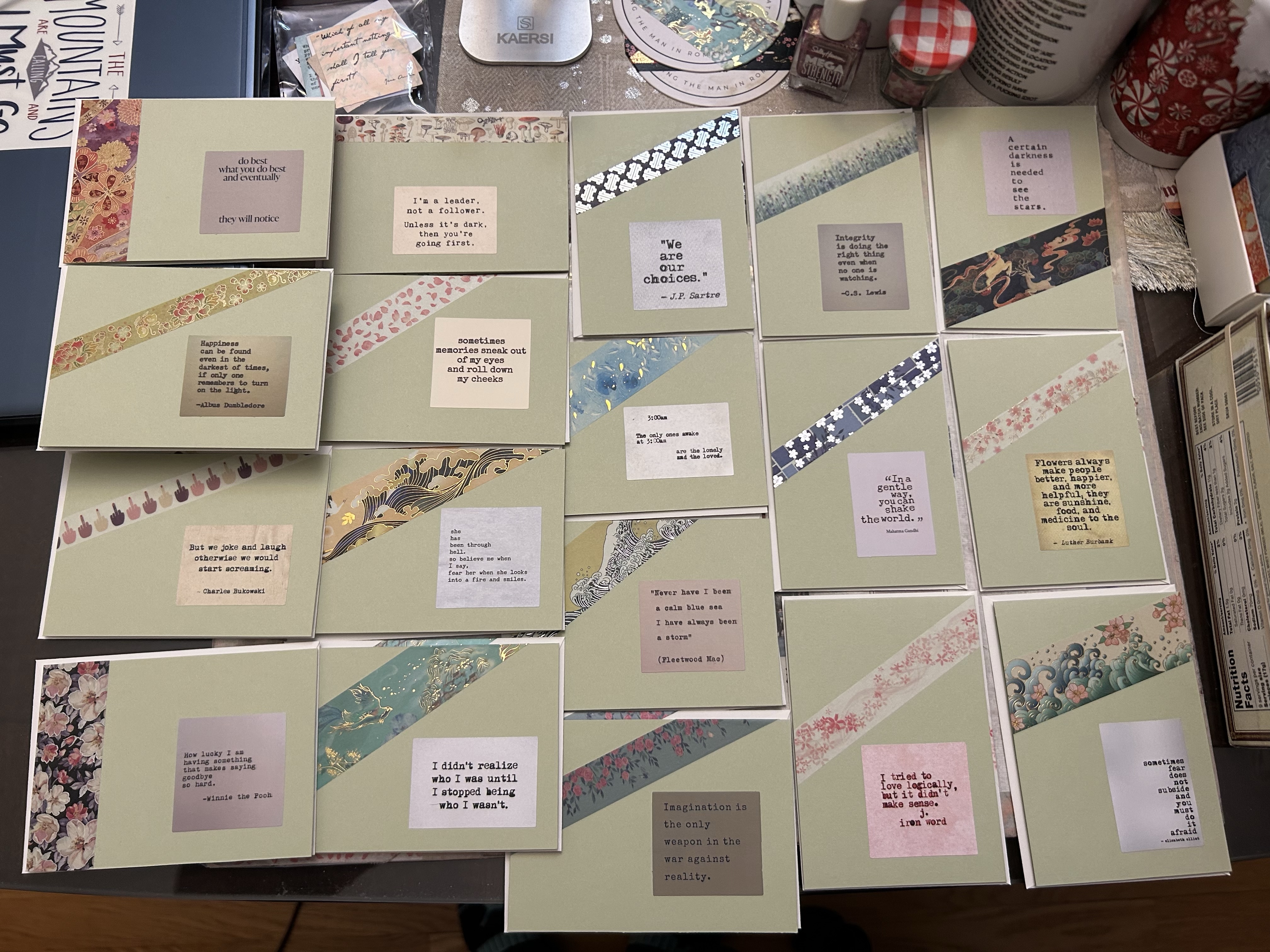 Then it occurred to me to invite friends to request notes! I’ve received two so far, and will continue to solicit all month. Meanwhile, the crafting bug bit me this weekend and after a great HIIT workout at Ethos yesterday morning I’ve basically been sitting, cutting, taping, stickering, and writing for two days (and listening to Of Prophecies and Pomegranates by TC Kraven–highly recommend!).