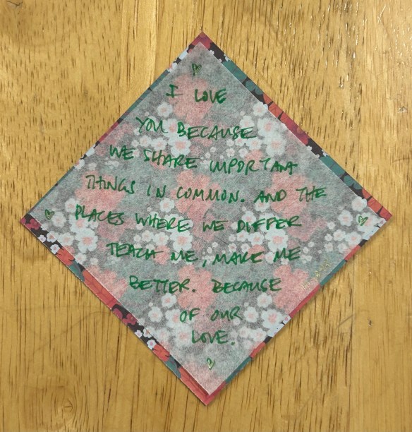 I am really starting to miss more long form posting here, how fascinating! We are 60% through this daily blogging challenge. Many thanks to all who have followed along (Hi Mick and Donna!), and welcome to any new friends! Now let’s see how much love we can find across difference: