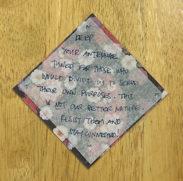 - Keep your antennae tuned for those who would divide us to serve their own purposes. This is NOT our better nature. Resist them and stay connected!