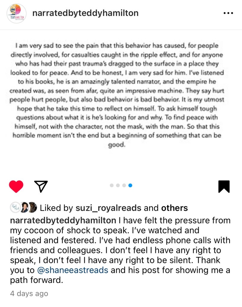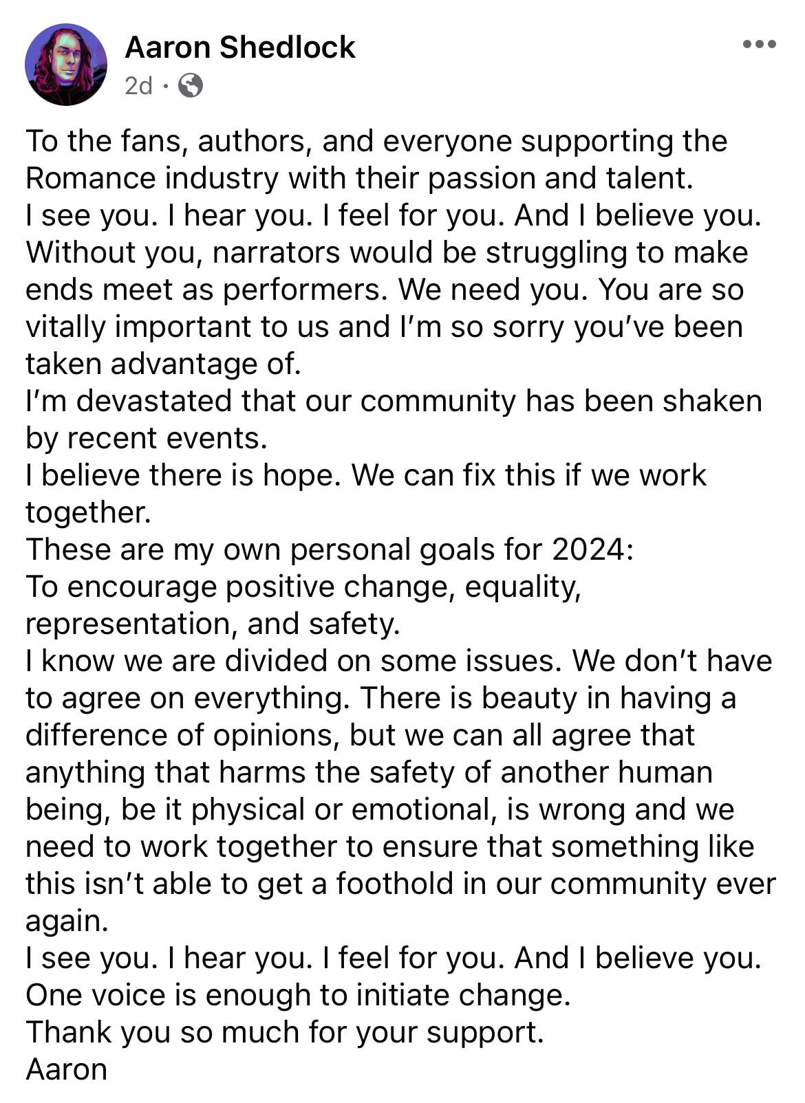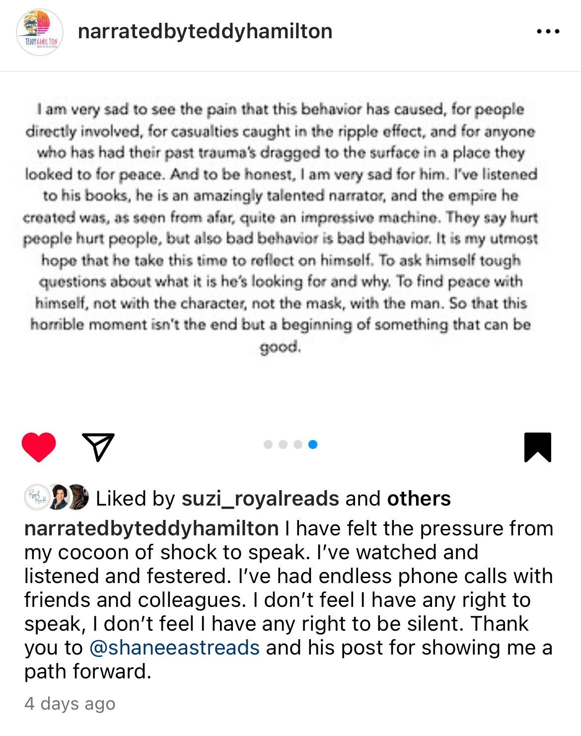 Watch this heartfelt video by author Cheri Champagne, describing how she is affected by the narrator/producer’s actions, as well as by the backlash against him and his company. The ripples reach far and wide. Thankfully, the community is rallying and hopefully all affected can come through with the least possible damage and trauma.
