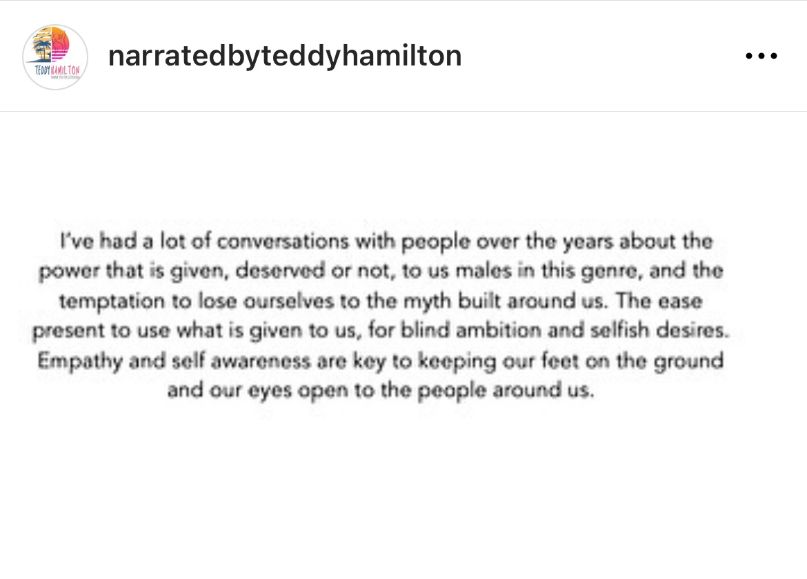 Messaging with a friend a few days into the controversy, I asked, “Wondering how any male narrators would be willing/able to step up as more visible, direct allies? This is always such a big ask… I would never want them to put their own careers or personal lives in jeopardy from any backlash or get entangled in unproductive arguing… I guess it’s a question we can all ask ourselves—how we can make the most effective positive difference in our own way, given our own circumstances… how much we are willing to risk, etc…”